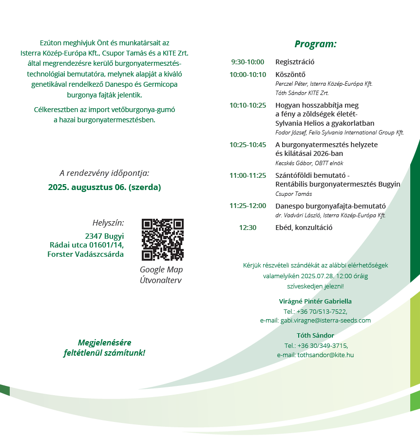 2022. július 1-jén 10:00 órakor keződő VETŐBURGONYA-SZAPORÍTÁS AKTUÁLIS KÉRDÉSEI, GYAKORLATA című tanácskozásra és fajtabemutatóra Berzencére. A meghívó ide kattintva tölthető le.